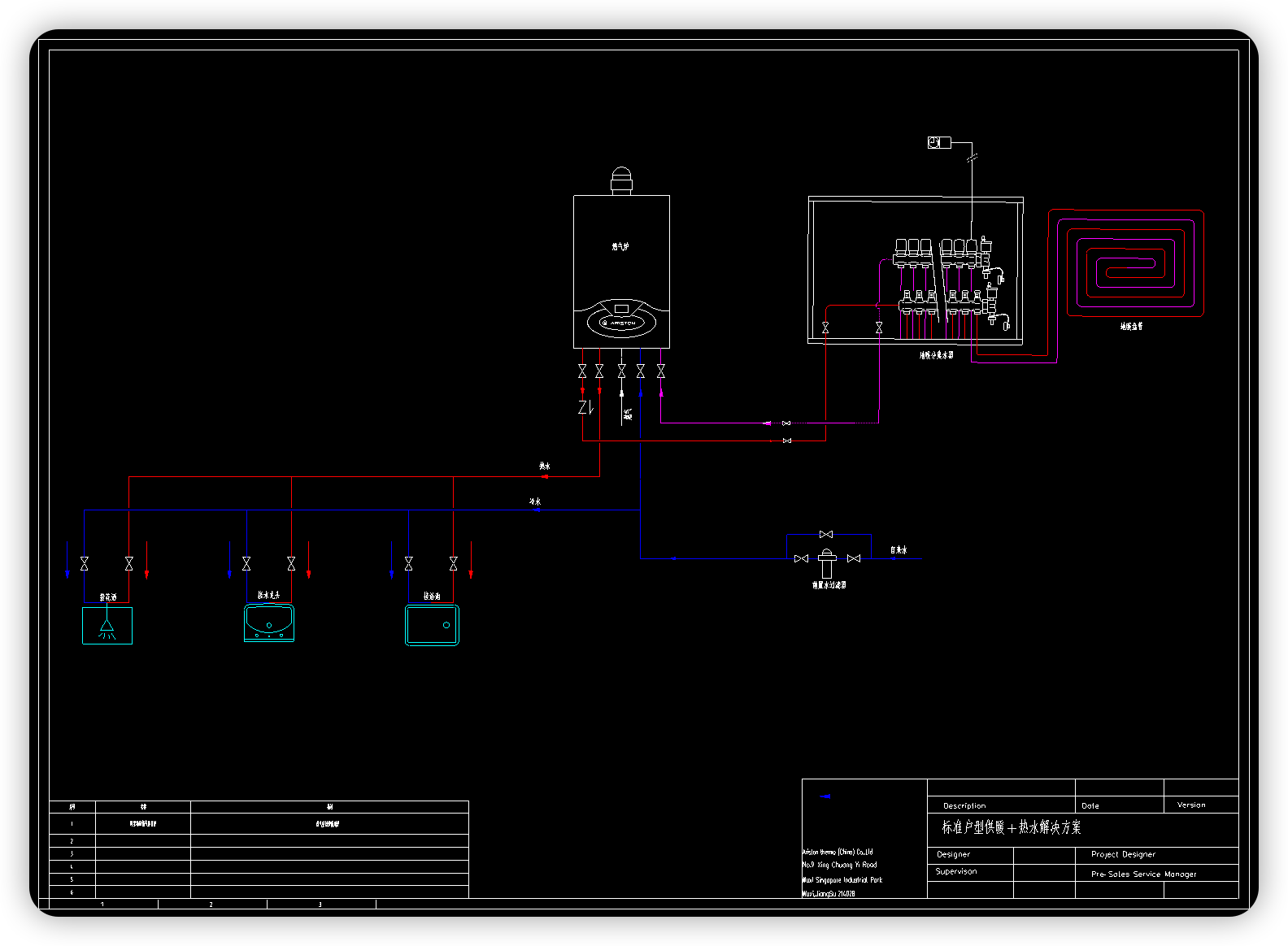 这是一套比较简易的燃气壁挂炉应用方案,热水与采暖一台设备搞定,无需多余的设备;不受天气影响,全年稳定输出。